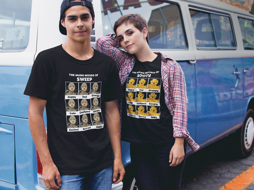 Express yourself with Sooty, Sweep, Soo, and little cousin Scampi! Our Many Moods tee collection captures every personality in fun, wearable designs. Available in sizes for men, women, and kids – because everyone deserves a character that matches their mood.